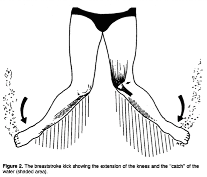 The wider that the knees and feet travel from the midline in the propulsive phase of the breaststroke kick, the more the groin load is increased. This is one of the reasons why the narrow knee “whip kick” is advocated:Groin pain in breaststrokers may present as an acute or sudden strain of one or more of the contributing muscle groups or their tendons, or develop more chronically as a result of repetitive overload and stress on a dysfunctional anatomical system.